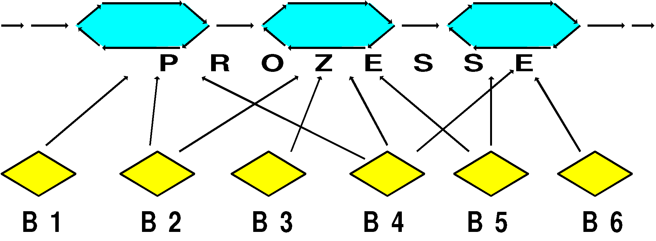 Zusammengenommen ergibt das eine Vorstellung der folgenden Art (siehe unten). Wenn hier zum Beispiel B 5 ausfällt (was immer dabei B 5 sein könnte), so führt das sowohl zu fehlerhaften ,Rahmungsprozessen wie zu ,Formulierungsdefiziten; und das, ohne daß man folgern dürfte, die Defizite bei den ,Formulierungsprozessen seien durch fehlerhafte ,Rahmungsprozesse ausgelöst worden. Und wenn gar B 4 ausfällt, dann macht sich das als Störung sowohl der ,Problem-Löse- wie der ,Rahmungs- wie auch der ,Formulierungsprozesse bemerkbar.